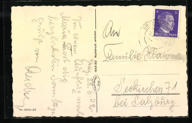 Personenbezogene Daten auf der Rückseite der Karte wurden durch blauen Textmarker unkenntlich gemacht. Die blauen Stellen sind auf die Vorderseite durchgeweicht und wirken sich negativ auf das Postkartenfoto aus