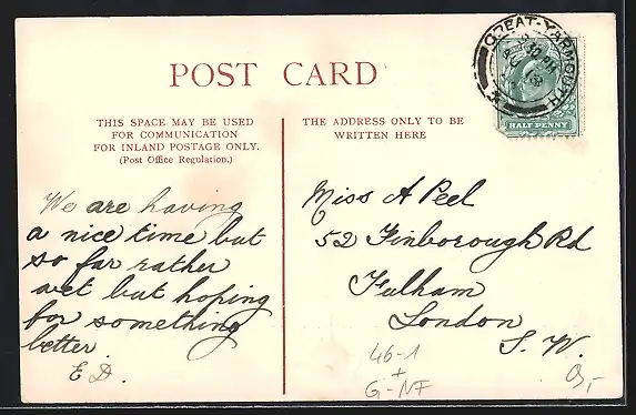 Personenbezogene Daten auf der Rückseite der Karte wurden durch blauen Textmarker unkenntlich gemacht. Die blauen Stellen sind auf die Vorderseite durchgeweicht und wirken sich negativ auf das Postkartenfoto aus