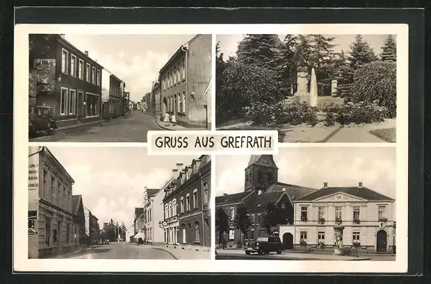 AK Grefrath, Strassenpartie mit Gasthaus, Strassenpartie mit Kirche u. Litfasssäule, Denkmal und Brunnen