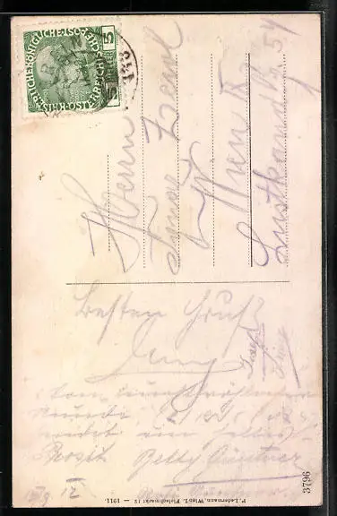Personenbezogene Daten auf der Rückseite der Karte wurden durch blauen Textmarker unkenntlich gemacht. Die blauen Stellen sind auf die Vorderseite durchgeweicht und wirken sich negativ auf das Postkartenfoto aus