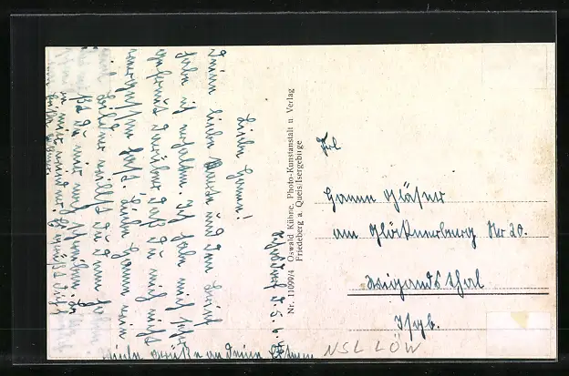 Personenbezogene Daten auf der Rückseite der Karte wurden durch blauen Textmarker unkenntlich gemacht. Die blauen Stellen sind auf die Vorderseite durchgeweicht und wirken sich negativ auf das Postkartenfoto aus