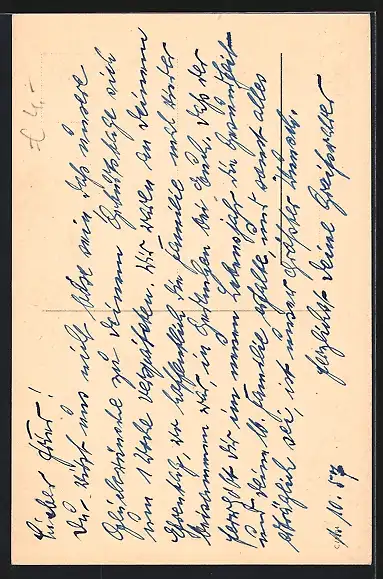 Personenbezogene Daten auf der Rückseite der Karte wurden durch blauen Textmarker unkenntlich gemacht. Die blauen Stellen sind auf die Vorderseite durchgeweicht und wirken sich negativ auf das Postkartenfoto aus