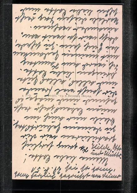 Personenbezogene Daten auf der Rückseite der Karte wurden durch blauen Textmarker unkenntlich gemacht. Die blauen Stellen sind auf die Vorderseite durchgeweicht und wirken sich negativ auf das Postkartenfoto aus