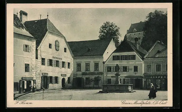 AK Grein, Denkmal und Rathaus am Marktplatz
