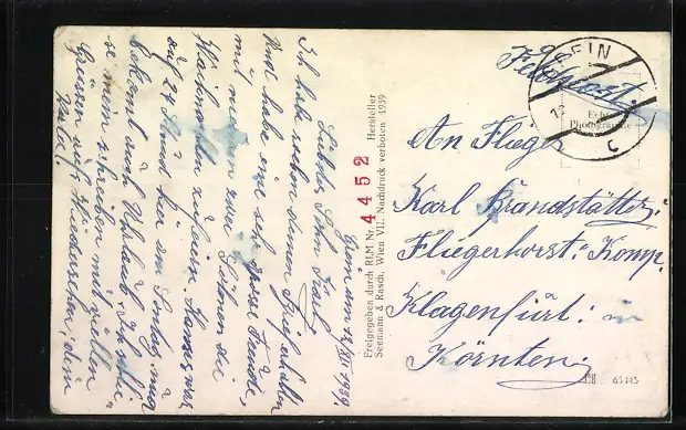 Personenbezogene Daten auf der Rückseite der Karte wurden durch blauen Textmarker unkenntlich gemacht. Die blauen Stellen sind auf die Vorderseite durchgeweicht und wirken sich negativ auf das Postkartenfoto aus