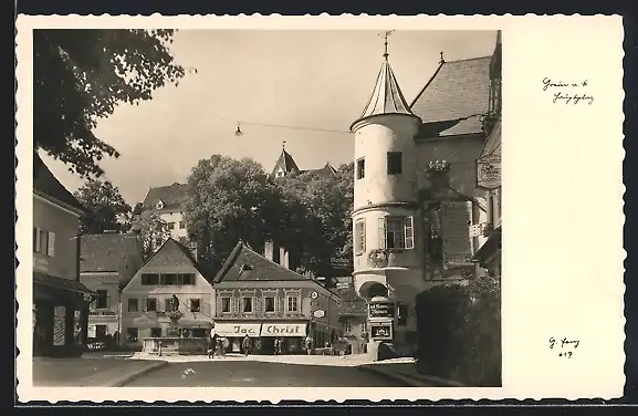 AK Grein a. d. Donau, Ortspartie mit Geschäft Jac. Christ