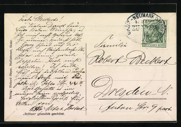 Personenbezogene Daten auf der Rückseite der Karte wurden durch blauen Textmarker unkenntlich gemacht. Die blauen Stellen sind auf die Vorderseite durchgeweicht und wirken sich negativ auf das Postkartenfoto aus