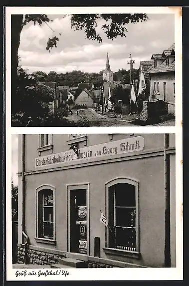 AK Gressthal, Strassenpartie mit Kirche, Bürstenfabrikation u. Kolonialwaren Georg Schmitt