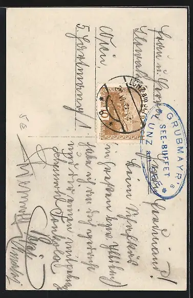 Personenbezogene Daten auf der Rückseite der Karte wurden durch blauen Textmarker unkenntlich gemacht. Die blauen Stellen sind auf die Vorderseite durchgeweicht und wirken sich negativ auf das Postkartenfoto aus