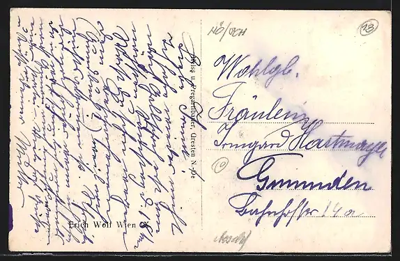 Personenbezogene Daten auf der Rückseite der Karte wurden durch blauen Textmarker unkenntlich gemacht. Die blauen Stellen sind auf die Vorderseite durchgeweicht und wirken sich negativ auf das Postkartenfoto aus
