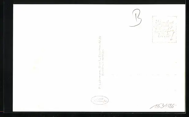 Personenbezogene Daten auf der Rückseite der Karte wurden durch blauen Textmarker unkenntlich gemacht. Die blauen Stellen sind auf die Vorderseite durchgeweicht und wirken sich negativ auf das Postkartenfoto aus