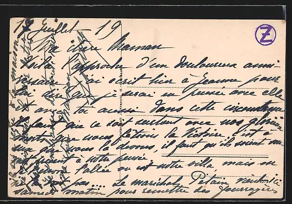 Personenbezogene Daten auf der Rückseite der Karte wurden durch blauen Textmarker unkenntlich gemacht. Die blauen Stellen sind auf die Vorderseite durchgeweicht und wirken sich negativ auf das Postkartenfoto aus