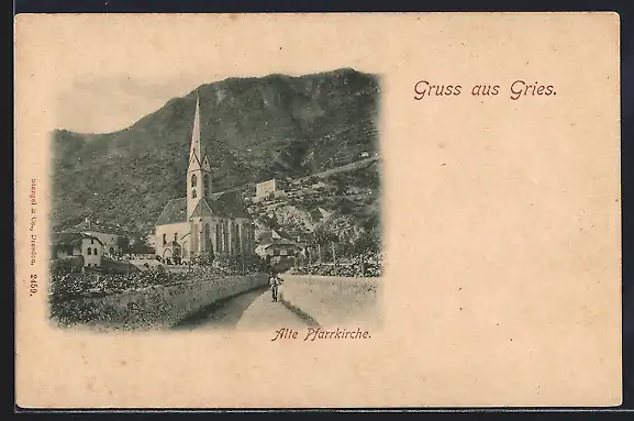 AK Gries, Alte Pfarrkirche mit Strassenpartie