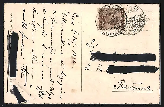Personenbezogene Daten auf der Rückseite der Karte wurden durch blauen Textmarker unkenntlich gemacht. Die blauen Stellen sind auf die Vorderseite durchgeweicht und wirken sich negativ auf das Postkartenfoto aus