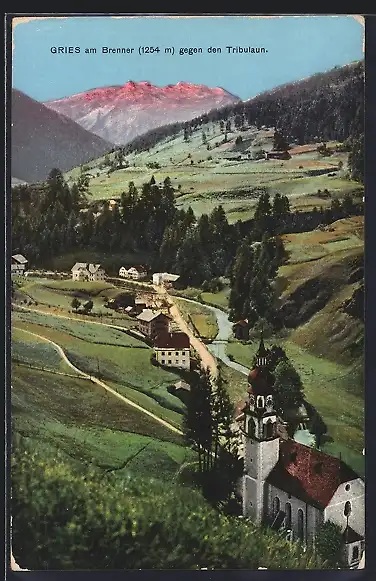 AK Gries a. Brenner, Partie aus dem Ort gegen Tribulaun, Kirche