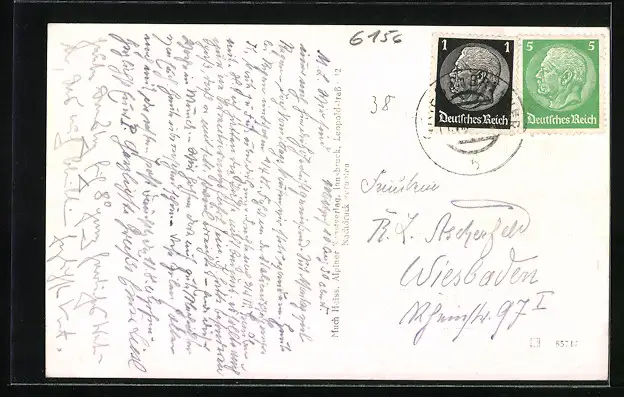 Personenbezogene Daten auf der Rückseite der Karte wurden durch blauen Textmarker unkenntlich gemacht. Die blauen Stellen sind auf die Vorderseite durchgeweicht und wirken sich negativ auf das Postkartenfoto aus