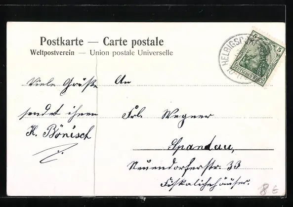 Personenbezogene Daten auf der Rückseite der Karte wurden durch blauen Textmarker unkenntlich gemacht. Die blauen Stellen sind auf die Vorderseite durchgeweicht und wirken sich negativ auf das Postkartenfoto aus