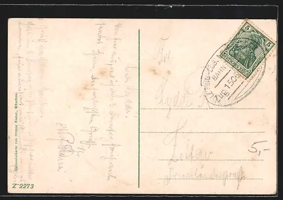 Personenbezogene Daten auf der Rückseite der Karte wurden durch blauen Textmarker unkenntlich gemacht. Die blauen Stellen sind auf die Vorderseite durchgeweicht und wirken sich negativ auf das Postkartenfoto aus
