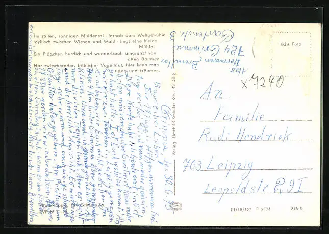 Personenbezogene Daten auf der Rückseite der Karte wurden durch blauen Textmarker unkenntlich gemacht. Die blauen Stellen sind auf die Vorderseite durchgeweicht und wirken sich negativ auf das Postkartenfoto aus