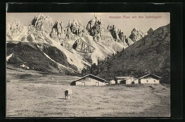 AK Grinzens, Rinder vor der Kemater Alpe mit Kalkkögel