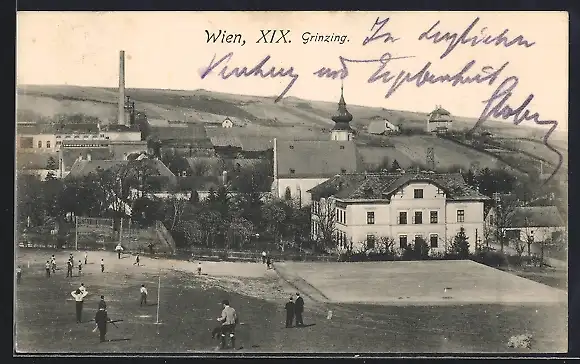 AK Grinzing /Wien, Ortsansicht mit Sportplatz