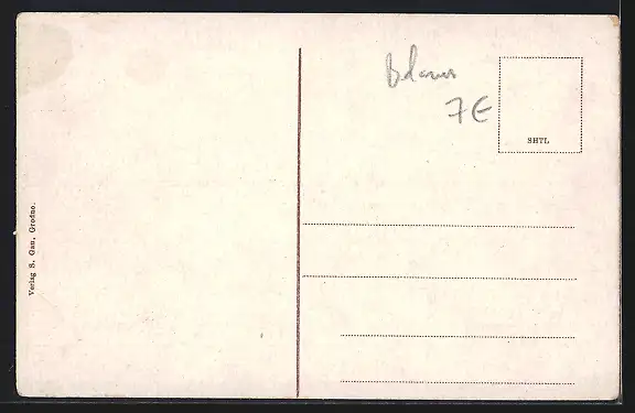 Personenbezogene Daten auf der Rückseite der Karte wurden durch blauen Textmarker unkenntlich gemacht. Die blauen Stellen sind auf die Vorderseite durchgeweicht und wirken sich negativ auf das Postkartenfoto aus