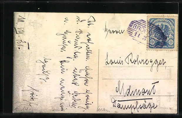 Personenbezogene Daten auf der Rückseite der Karte wurden durch blauen Textmarker unkenntlich gemacht. Die blauen Stellen sind auf die Vorderseite durchgeweicht und wirken sich negativ auf das Postkartenfoto aus