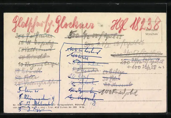 Personenbezogene Daten auf der Rückseite der Karte wurden durch blauen Textmarker unkenntlich gemacht. Die blauen Stellen sind auf die Vorderseite durchgeweicht und wirken sich negativ auf das Postkartenfoto aus