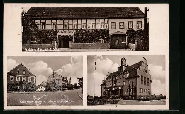AK Gröditz, Gasthof Richter, Strasse mit Schule und Kirche
