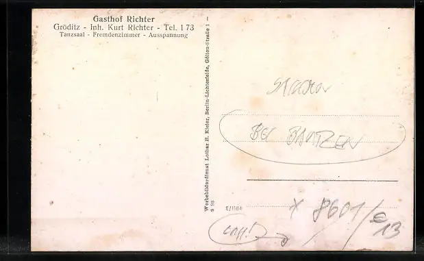 Personenbezogene Daten auf der Rückseite der Karte wurden durch blauen Textmarker unkenntlich gemacht. Die blauen Stellen sind auf die Vorderseite durchgeweicht und wirken sich negativ auf das Postkartenfoto aus