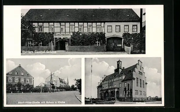 AK Gröditz, Richters Gasthof Gröditz, Strasse mit Schule und Kirche, Rathaus