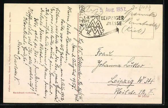 ungelaufen, Rückseite beschrieben 1957, guter Zustand