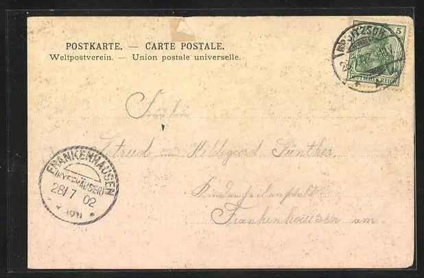 alte Ansichtskarte, gelaufen 1902, Eckknick li. unten, geklebter Einriss oben mittig, guter Zustand
