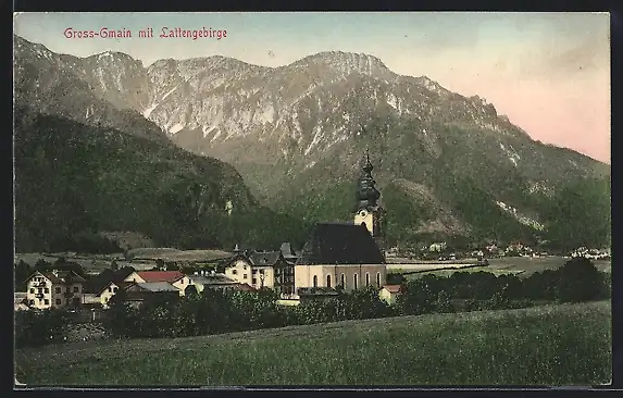 AK Gross-Gmain, Ortspartie mit Kirche und Lattengebirge