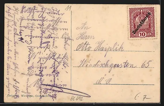 Personenbezogene Daten auf der Rückseite der Karte wurden durch blauen Textmarker unkenntlich gemacht. Die blauen Stellen sind auf die Vorderseite durchgeweicht und wirken sich negativ auf das Postkartenfoto aus
