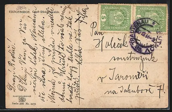 Personenbezogene Daten auf der Rückseite der Karte wurden durch blauen Textmarker unkenntlich gemacht. Die blauen Stellen sind auf die Vorderseite durchgeweicht und wirken sich negativ auf das Postkartenfoto aus