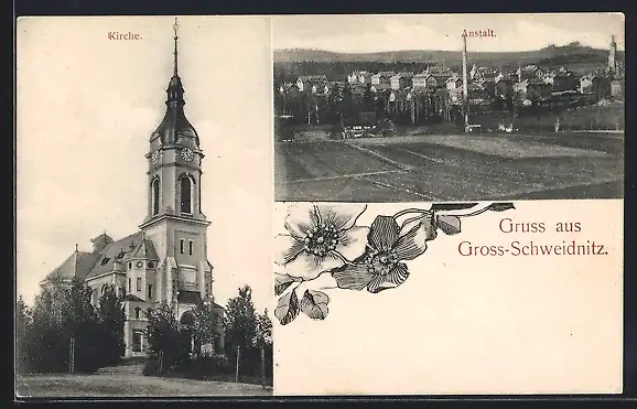 AK Gross-Schweidnitz, Kirche und Anstalt