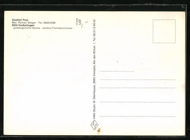 Personenbezogene Daten auf der Rückseite der Karte wurden durch blauen Textmarker unkenntlich gemacht. Die blauen Stellen sind auf die Vorderseite durchgeweicht und wirken sich negativ auf das Postkartenfoto aus