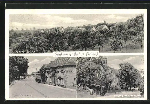 AK Grosserlach /Württ., Kirche mit Pfarrhaus, Strassenpartie, Totalansicht