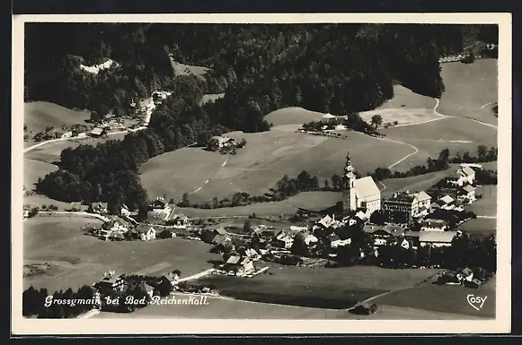 AK Grossgmain, Ortsansicht aus der Vogelschau mit Kirche