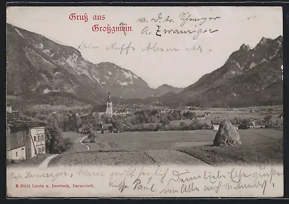 AK Grossgmain, Ortsansicht mit Kirche über Feld mit Gebirge