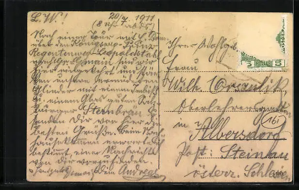alte Ansichtskarte, gelaufen 1911, Briefmarke entfernt, rückseitig Oberflächenschaden, Eckknick re. unten, guter Zustand