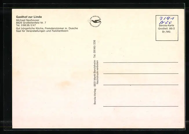 Personenbezogene Daten auf der Rückseite der Karte wurden durch blauen Textmarker unkenntlich gemacht. Die blauen Stellen sind auf die Vorderseite durchgeweicht und wirken sich negativ auf das Postkartenfoto aus