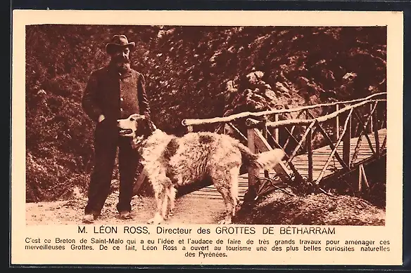 AK Grottes de Betharram, M.Leon Ross mit seinem Pyrenäenberghund vor den Höhlen