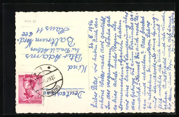 Personenbezogene Daten auf der Rückseite der Karte wurden durch blauen Textmarker unkenntlich gemacht. Die blauen Stellen sind auf die Vorderseite durchgeweicht und wirken sich negativ auf das Postkartenfoto aus