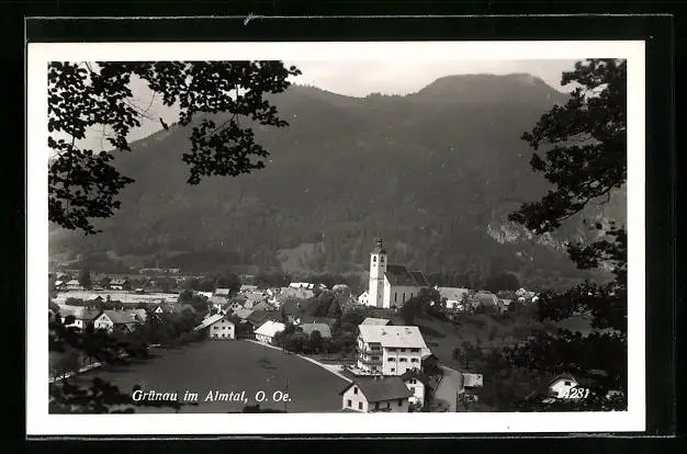 AK Grünau im Almtal, Panorama mit Gebirgswand