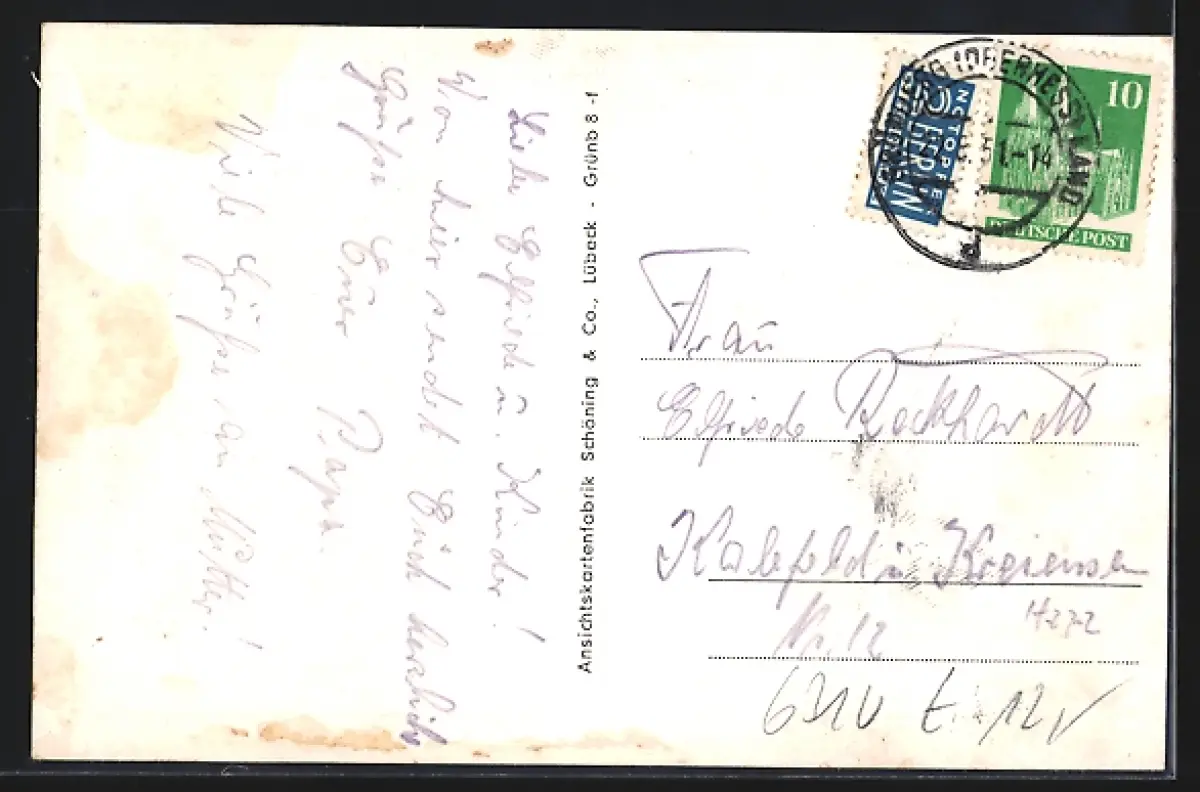 Personenbezogene Daten auf der Rückseite der Karte wurden durch blauen Textmarker unkenntlich gemacht. Die blauen Stellen sind auf die Vorderseite durchgeweicht und wirken sich negativ auf das Postkartenfoto aus