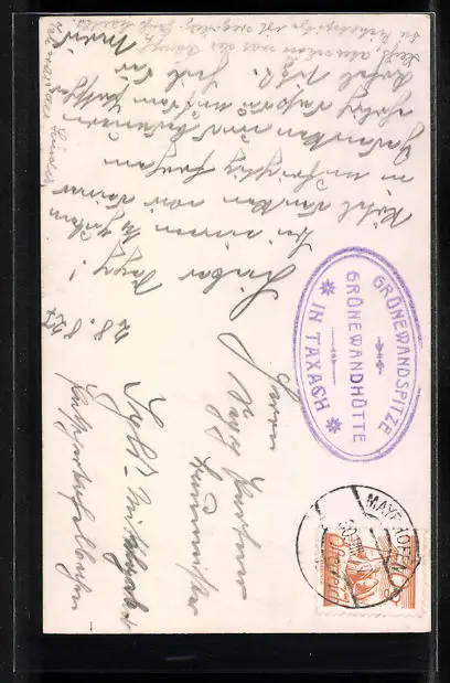 Personenbezogene Daten auf der Rückseite der Karte wurden durch blauen Textmarker unkenntlich gemacht. Die blauen Stellen sind auf die Vorderseite durchgeweicht und wirken sich negativ auf das Postkartenfoto aus