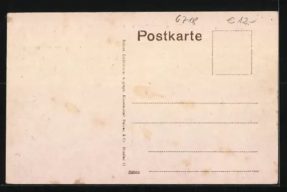 Personenbezogene Daten auf der Rückseite der Karte wurden durch blauen Textmarker unkenntlich gemacht. Die blauen Stellen sind auf die Vorderseite durchgeweicht und wirken sich negativ auf das Postkartenfoto aus