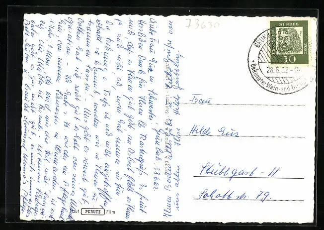Personenbezogene Daten auf der Rückseite der Karte wurden durch blauen Textmarker unkenntlich gemacht. Die blauen Stellen sind auf die Vorderseite durchgeweicht und wirken sich negativ auf das Postkartenfoto aus